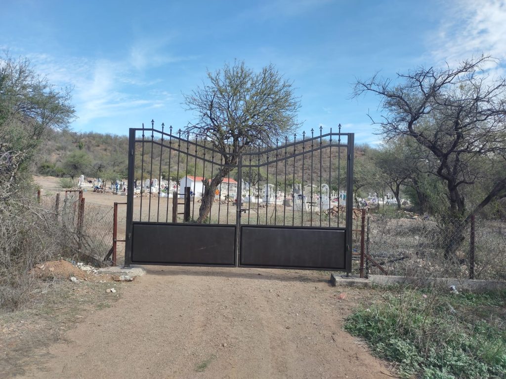 El H. Ayuntamiento de Sahuaripa llevó a cabo la instalación de un portón de herrería en la entrada del Cementerio de la comunidad del Valle de Tacupeto, como parte de las acciones encaminadas a mejorar la seguridad y la imagen urbana de los espacios públicos del municipio.